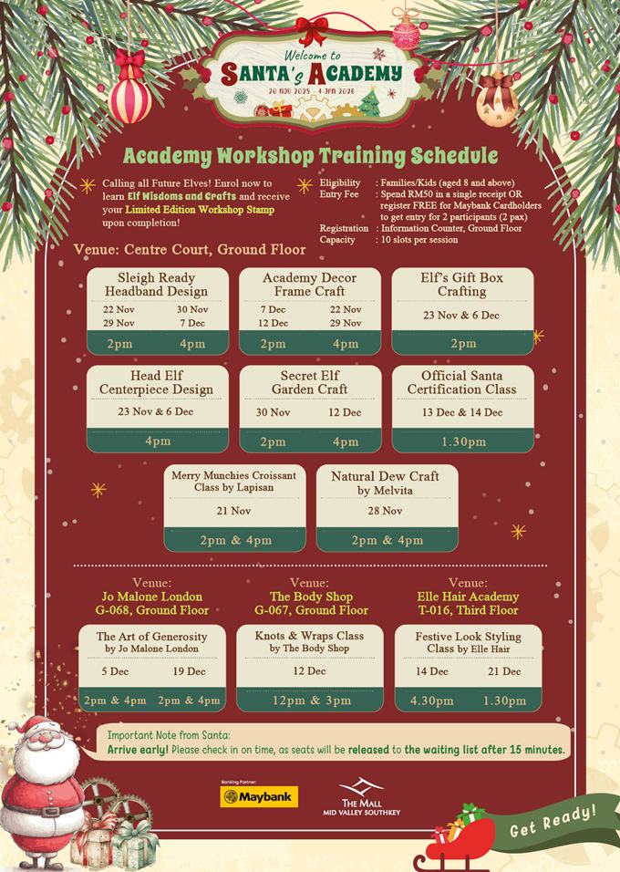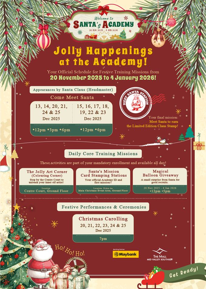 The scent of pine and the promise of festive magic herald the grand opening of Santa's Academy, and you are cordially invited to enrol! Step into the heart of Christmas preparation this season as The Mall, Mid Valley Southkey transforms into an interactive training ground where children, young and old, can truly understand the meaning of Christmas cheer. As the Academy doors open, a delightful array of workshops, performances, and special missions await every aspiring elf.
